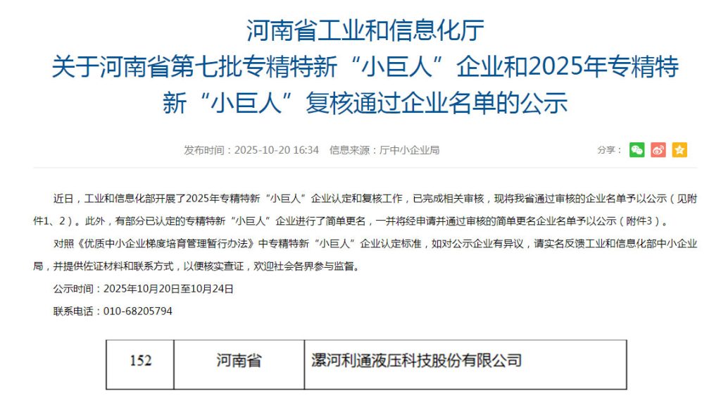 近日,国家工业和信息化部圆满完成2025年专精特新“小巨人”企业认定和复核工作,并由河南省工信厅对省内通过企业名单进行了公示。江南app官方入口网站 科技凭借在技术创新、产品品质、市场应用、品牌建设、产业链配套及精细化管理等领域的综合实力,成功通过专精特新“小巨人”企业复审,再次彰显超高压流体技术领域标杆地位。