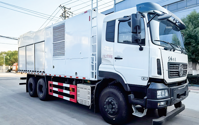 高压力、大流量:机组自主研发设计,高压泵引进美国进口技术,整机采用柴油发动机驱动450T型高速大流量泵,流量可达900L/min,压力可达250bar的环保低音高效疏通装备。