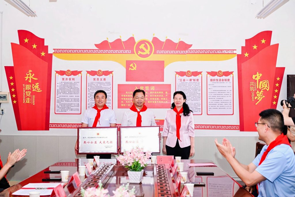 科技董事长赵洪亮和长江商学院企业家张磊颁发爱心捐赠牌匾。“热心公益,大爱无疆”八个大字,既是对新时代企业家富而思源,勇担社会责任精神的高度赞扬,也体现了爱心企业对农村教育事业的大力支持和对孩子们的深切关怀。