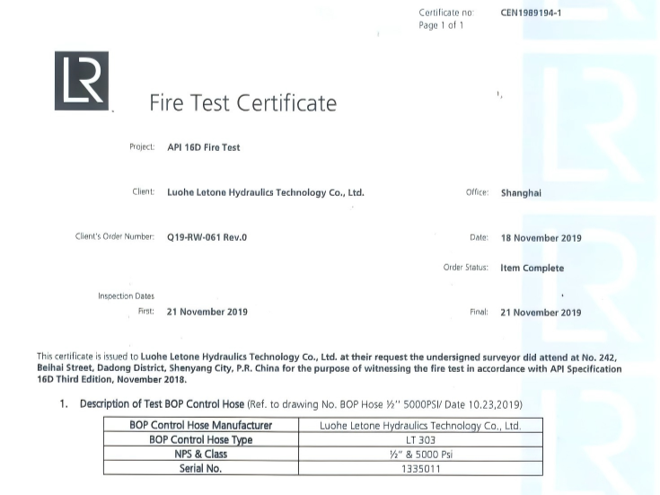 | 软管执行标准 | API 17K第三版 | 小爆破压力 | 232.5bar |